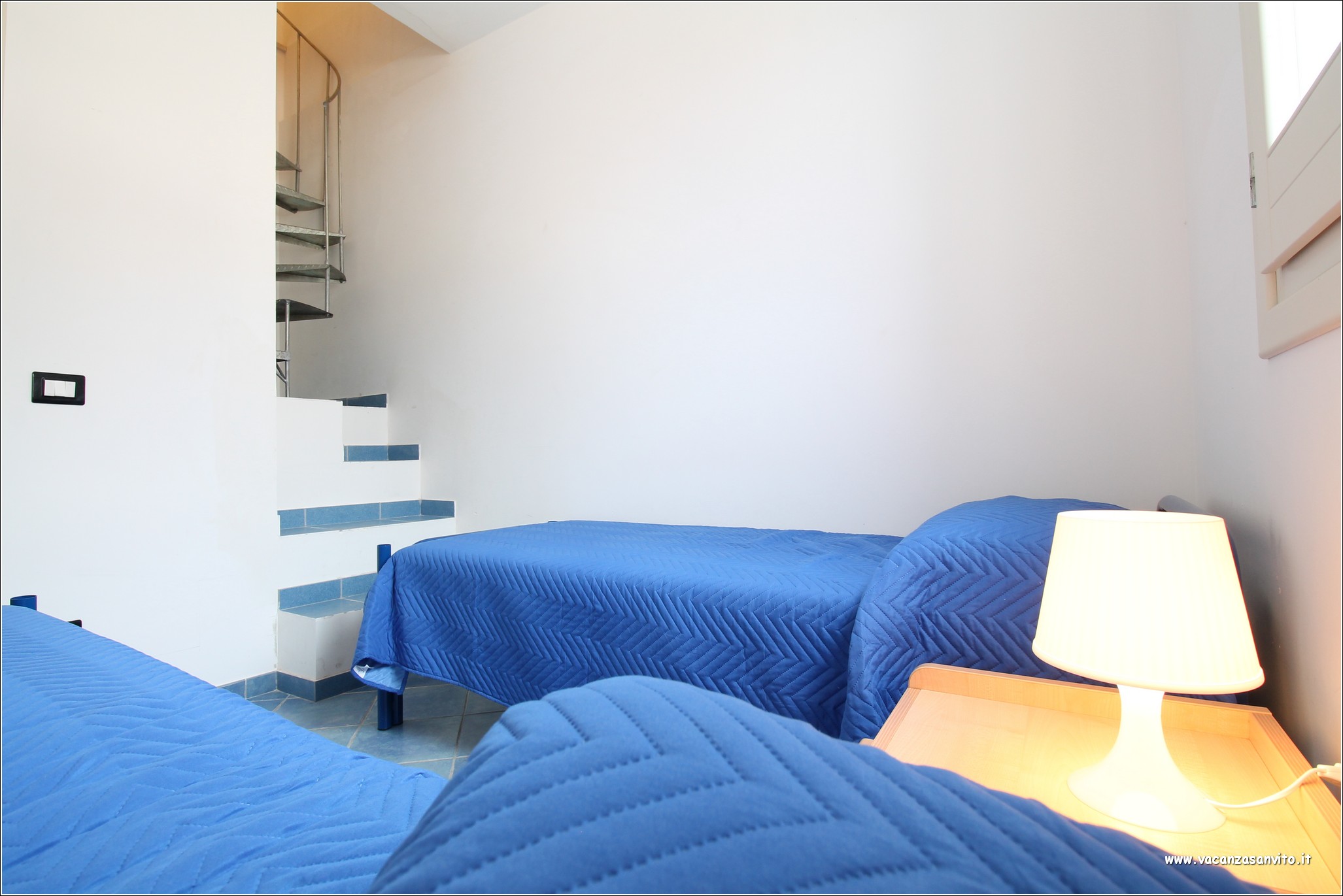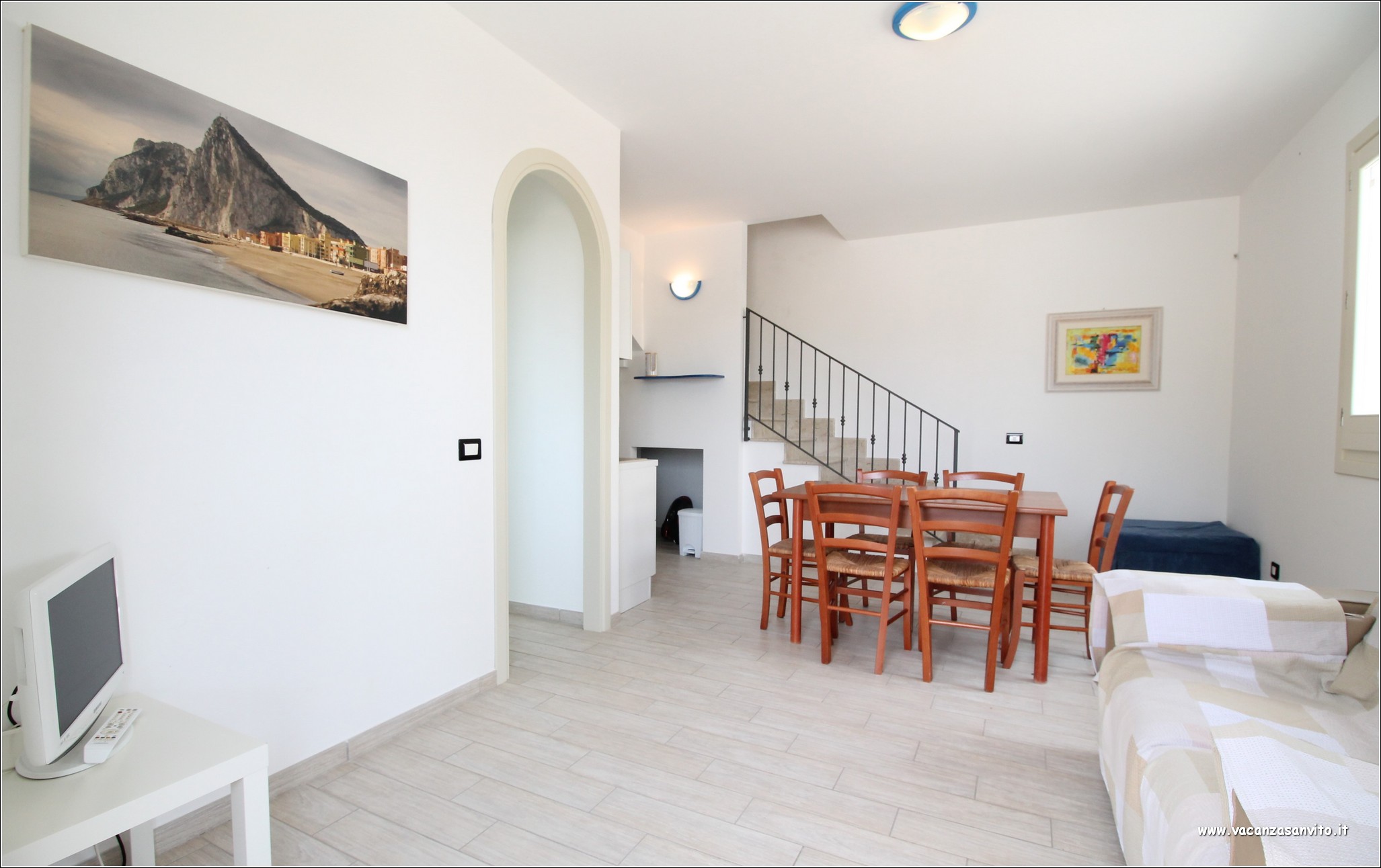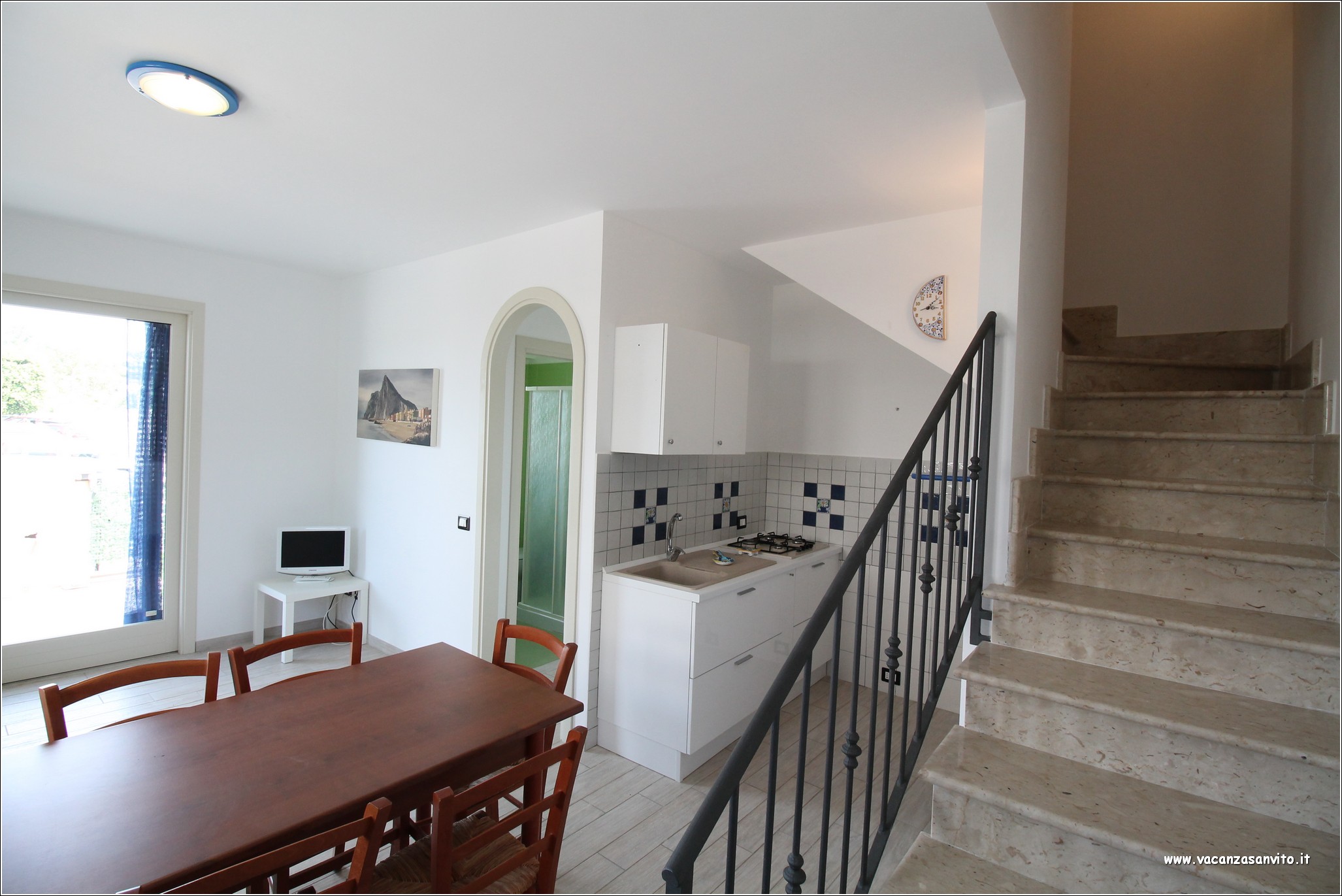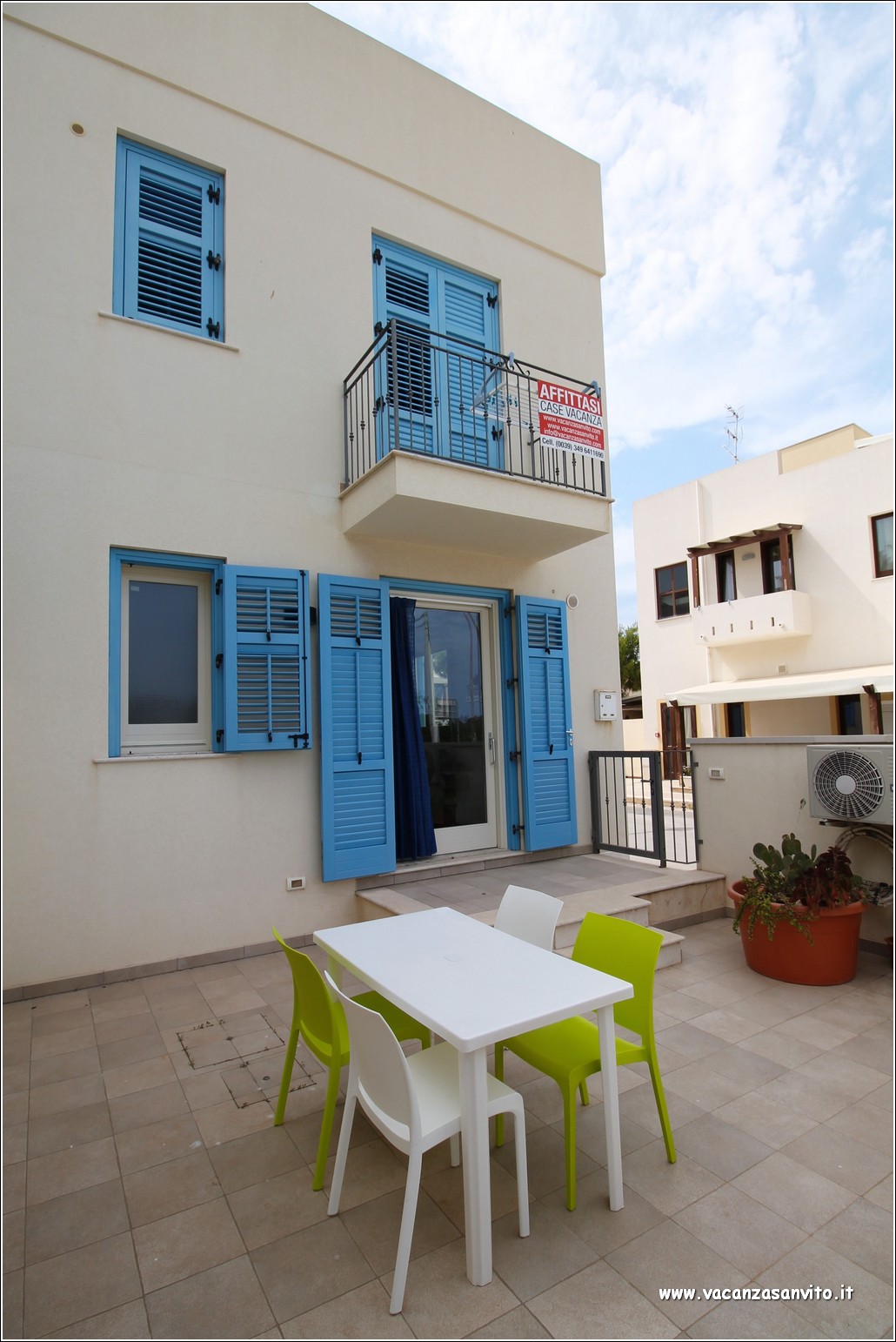 La casa Ulisse fa parte dello stesso residence in cui si trovano Venere, Enea, Polena e Cassandra, ovvero, residence Costa Turchese. Questa casa, più delle altre, è vicina alla spiaggia, ovvero 20-30 metri effettivi di percorso. L‘immobile si sviluppa su due livelli, piano terra e primo piano. Si accede da una veranda al piano terra, ampia circa 16 mq, con posto auto e spazio per tavolo e sedie. Si entra direttamente in soggiorno con angolo cottura. Sempre al piano terra si trova la lavanderia ed uno dei due bagni. Dalla scala in muratura si accede al primo piano, zona notte, ovvero alle due camere da letto, una matrimoniale ed una doppia che all‘occorrenza si trasforma in matrimoniale, avvicinando i letti, nonchè al secondo bagno. Dalla cameretta si accede, tramite una scala a chiocciola, alla terrazza della casa con vista strepitosa sulla spiaggia di San Vito lo Capo. La terrazza è accessoriata con tavolo e sedie, adatte alle colazioni e cene all‘aperto. La casa dispone di un solo impianto di climatizzazione, posizionato nella camera da letto matrimoniale, che viste le dimensioni ridotte del primo piano è sufficiente a raffreddare anche l‘altra camera. La casa può ospitare fino ad un massimo di 4/5 persone (con l‘aggiunta di una branda/pouf per la quinta persona), ed è accessoriata di lavatrice, tv, ferro da stiro, phon, barbecue, wifi ed appunto aria condizionata.
